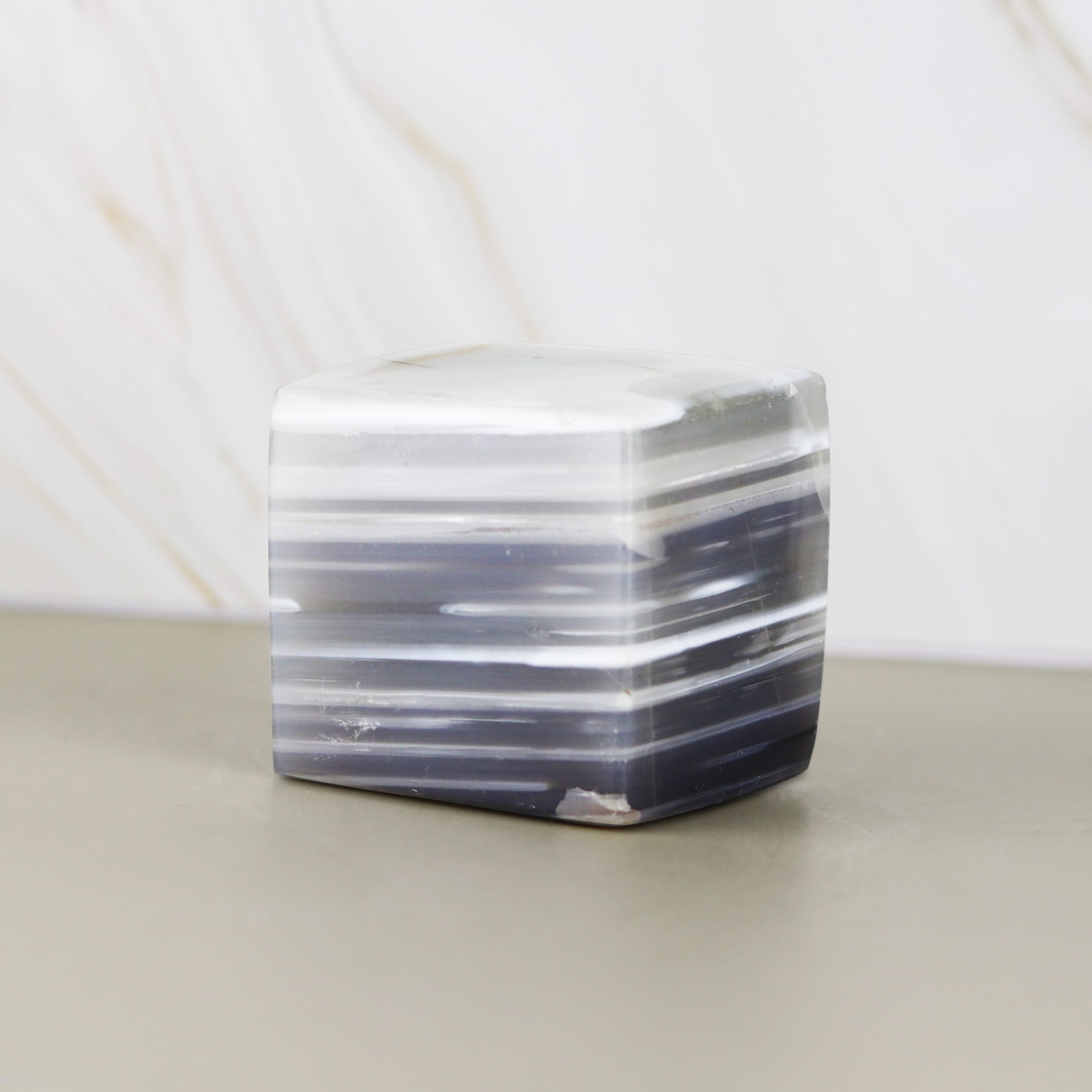 Our Agate Cubes merge the raw, banded beauty of natural stone with sophisticated architectural precision. Masterfully shaped into a balanced six-sided form, each cube reveals the intricate layers and subtle translucency characteristic of high-quality Agate. Because this mineral forms through the slow, rhythmic deposition of silica in volcanic cavities, every piece boasts a unique pattern of sweeping lines and rich colours.